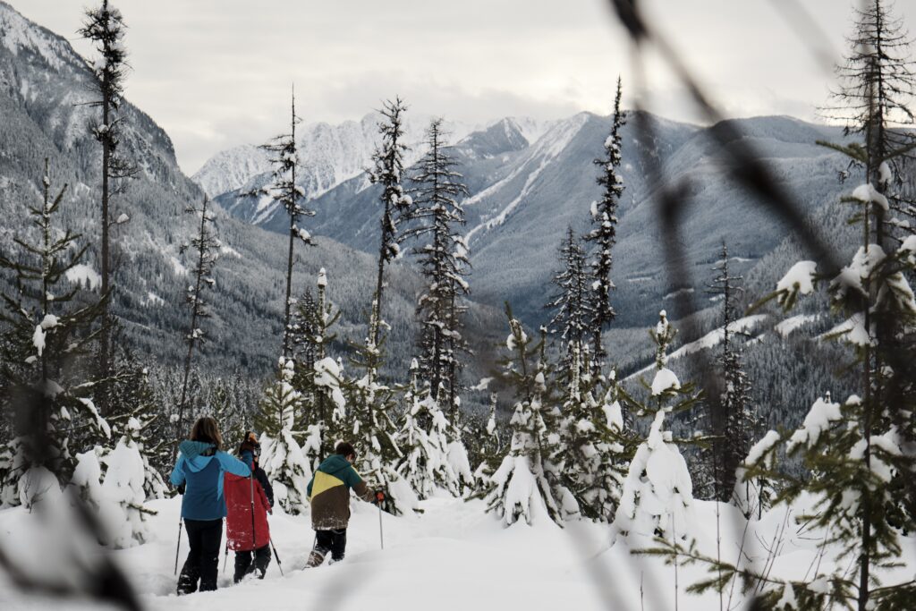 The flat, accessible Slocan Valley Rail Trail is ideal for leisurely snowshoeing and beginner Nordic skiing, offering picturesque views of the Slocan River.