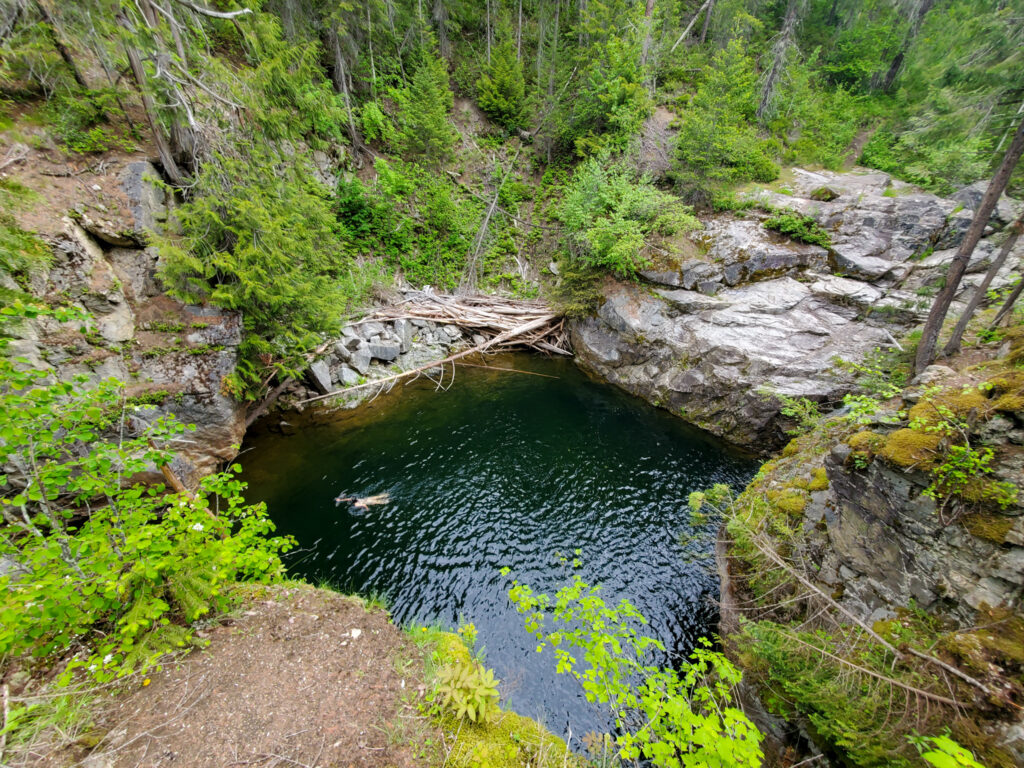 Cliff jumping off the tall rocks at Hippy Hole as you climb towards Whatshan Lake