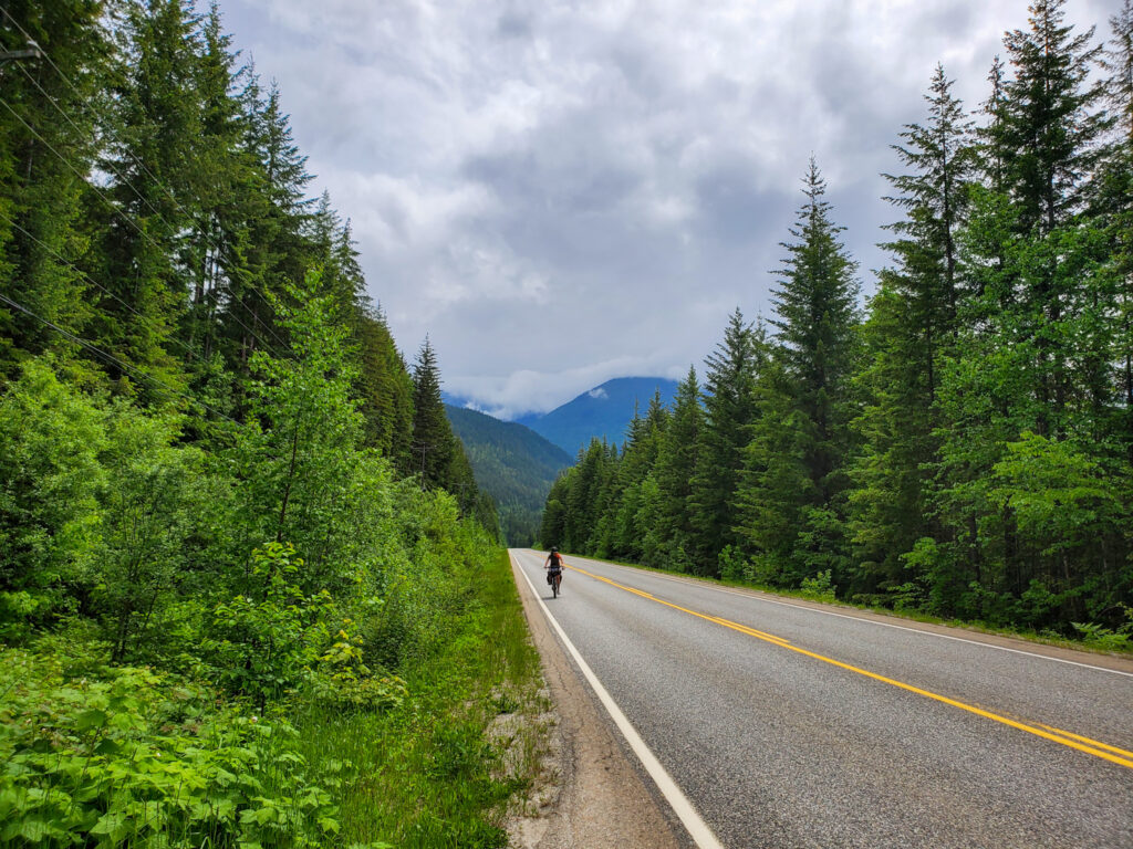 After a cruisy ten kilometers of paved road through the Edgewood Valley to the junction with Highway 6, the route turns right and grinds up the road to the Whatshan Lake Road turnoff.
