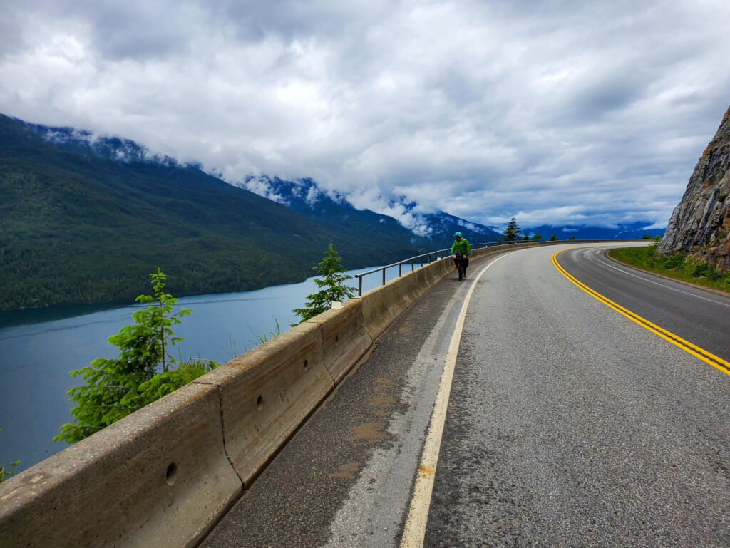 - The optional (but worthwhile) 13km paved (and quiet) climb up to the Nakusp Hot Springs (which offers tent camping at $20/night and a great descent the next morning)
